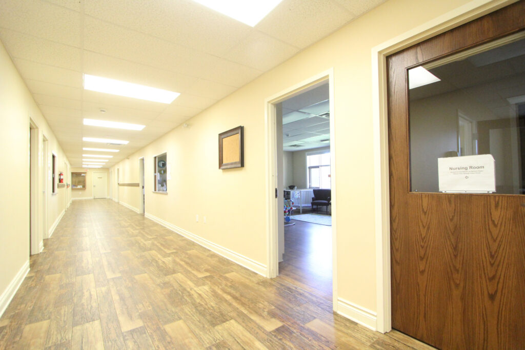 Washrooms are located down the hallway to the right, and child care for infants through preschool-aged children is available down the hallway to the left of the main doors.